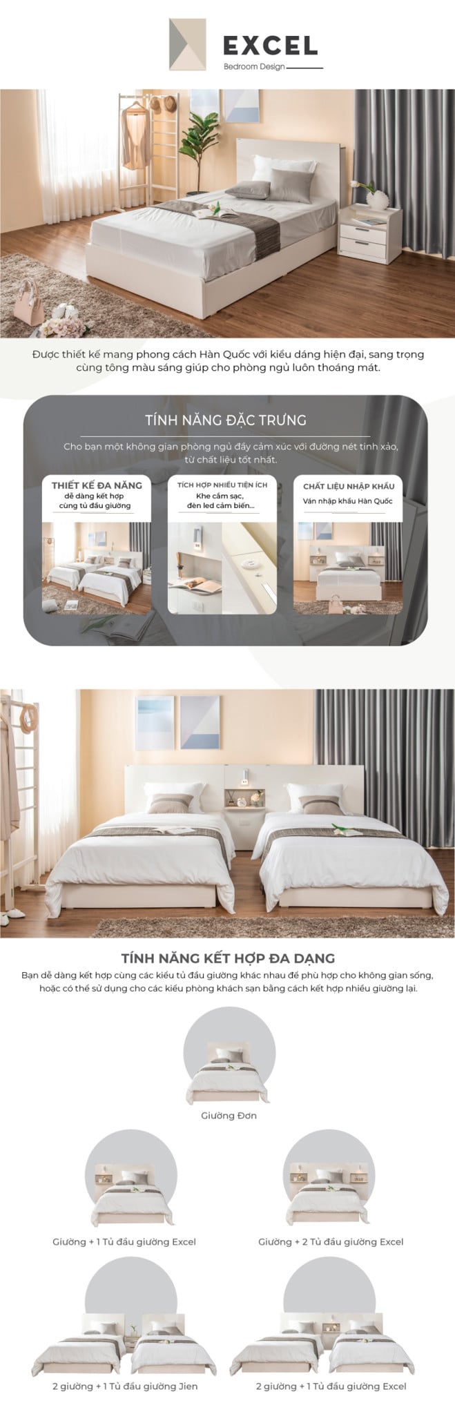 Giường ExcelĐược thiết kế phong cách hiện đại, sang trọng với tông màu sáng giúp cho phòng ngủ luôn thoáng mát. Nguyên liệu ván nhập từ Hàn Quốc, lắp ráp tại Việt Nam Đèn ngủ có thể tùy chỉnh xoay các góc độ theo ý thích*Giá trên chưa bao gồm Tủ đầu giường 2 bên